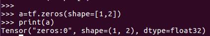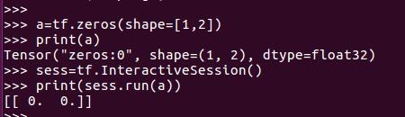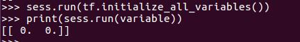 tensor = tf.zeros(shape=[1,2]) variable = tf.Variable(tensor) sess = tf.InteractiveSession() # print(sess.run(variable)) # 会报错 sess.run(tf.initialize_all_variables()) # 对variable进行初始化 print(sess.run(variable))