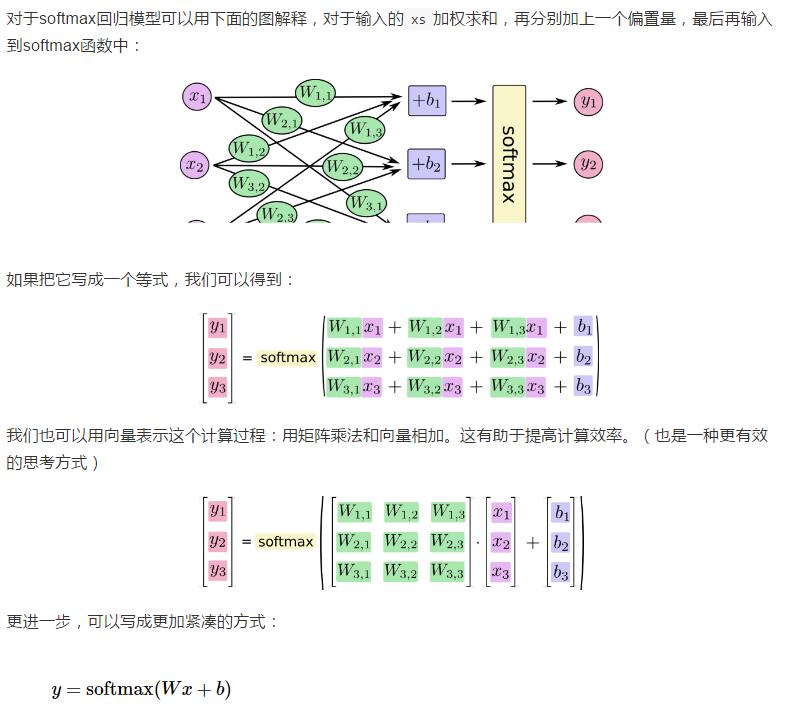 我们也需要加入一个额外的偏置量(bias),因为输入往往会带有一些无关的干扰量。因此对于给定的输入图片 x 它代表的是数字 i 的证据可以表示为