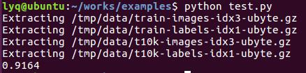sess = tf.InteractiveSession() # 建立交互式会话 tf.initialize_all_variables().run() # 所有变量初始化 for i in range(1000): batch_xs, batch_ys = mnist.train.next_batch(100) # 获得一批100个数据 train.run({x: batch_xs, y: batch_ys}) # 给训练模型提供输入和输出 print(sess.run(accuracy,feed_dict={x:mnist.test.images,y:mnist.test.labels}))