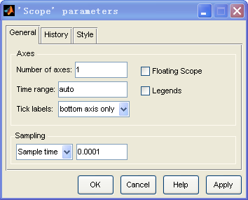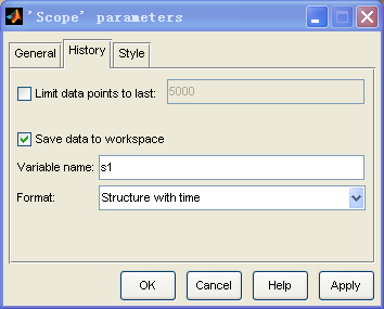 2、scope配置如下图:sampling处选择sample time,勾选save to workspace,给数据命名并选择struct with time。之后点击运行(这一步必须做,不然workspace中看不到序列)