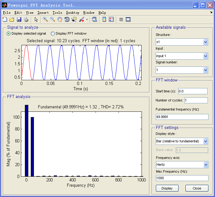 总结:powergui谐波分析时候需要手动输入基频,所以在对实际电网信号分析时候并不方便,因为自己无法得知采集数据时候电网信号的频率,这样分析会有误差,但是可以作为参考。