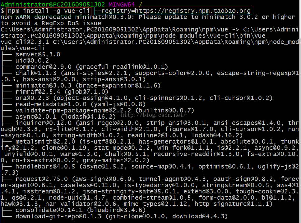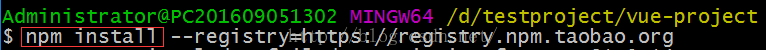 红框里是安装命令,由于npm网站在国内速度非常慢,所以在命令后面加上淘宝的镜像, 很快就安装好了.也可以使用cnpm安装.