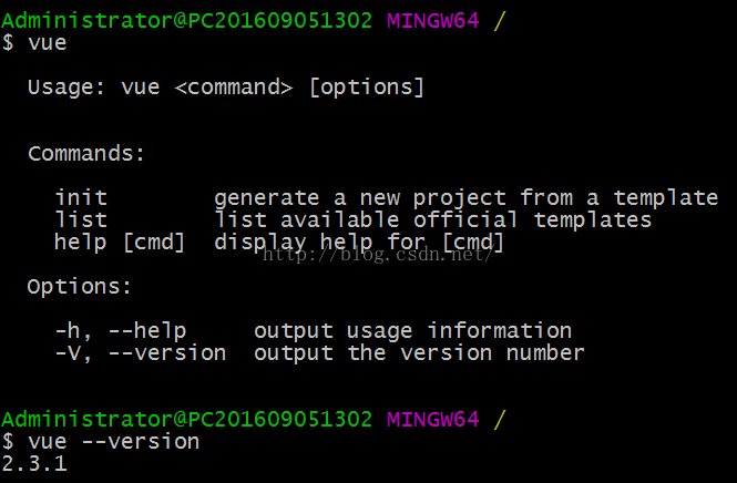 -g表示全局安装, vue-cli是模块,全局安装的模块可以在命令行直接使用.