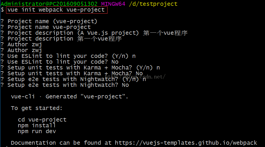 按照提示输入,项目名,项目描述,项目作者等等,看到最后这句项目就创建好了, 项目结构:这是安装了依赖以后的截图,没安装依赖以前是没有node_modules文件夹的