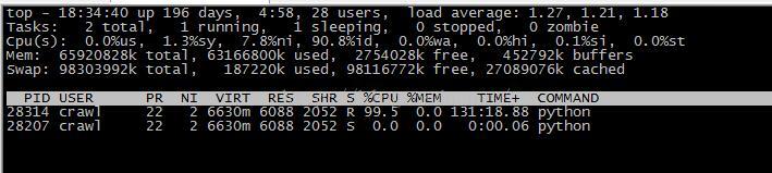 #-*- coding:utf-8 -*- import time, threading #测试线程的个数 num = 500 def loop(): print "thread %s is running..." % threading.current_thread().name k = 0 while k < 500: k += 1 time.sleep(1) def special(): print "thread %s is running..." % threading.current_thread().name while True: pass #启动一些普通线程 for i in range(num): t = threading.Thread(target=loop, name="normal-" + str(i)) t.start() t = threading.Thread(target=special, name="special") t.start()在linux系统中,使用 python cpu.py 运行该程序。