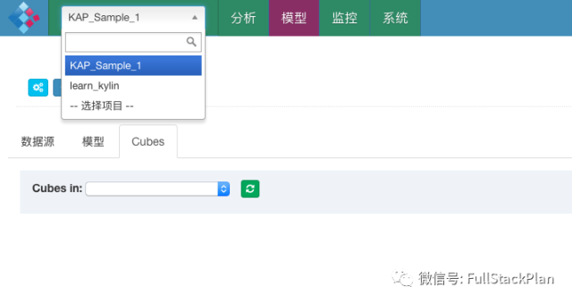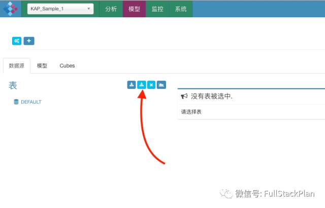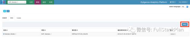 打开Kylin的Web UI,在左上角项目列表中选择刚刚创建的KAPSample1项目,然后进入“模型”页面,并创建一个模型。