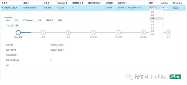 首先打开Kylin的Web UI,并选择KylinSample1项目,然后跳转到模型页面,找到Cube列表。 第一步,在Cube列表中找到KylinSampleCube_1。单击右侧的Action按钮,在弹出的菜单中选择“构建”。