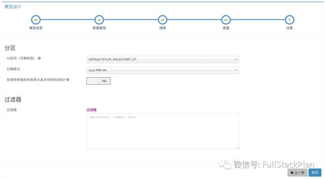 第五步,设置根据时间分段。一般来说,销售数据都是与日俱增的,每天都会有新数据通过ETL到达Hive中,需要选择增量构建方式构建Cube,所以需要选择用于分段的时间字段DEFAULT.KYLINSALES.PARTDT。根据样例数据可以看到,这一列时间的格式是yyyy-MM-dd,所以选择对应的日期格式。此外,我们既不需要设置单独的分区时间列,也不需要添加固定的过滤条件。设置效果如下图所示。
