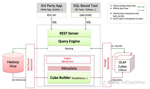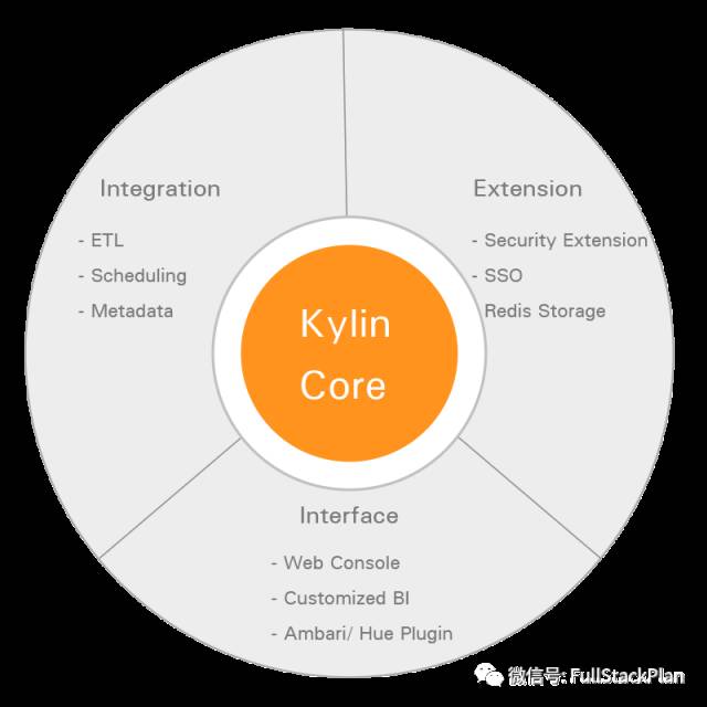 Kylin 核心: Kylin OLAP引擎基础框架,包括元数据(Metadata)引擎,查询引擎,Job引擎及存储引擎等,同时包括REST服务器以响应客户端请求