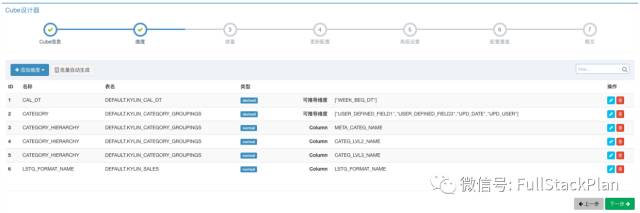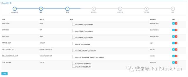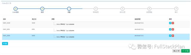 第三步,根据数据分析中的聚合需求,我们需要为Cube定义度量的聚合形式。默认的,根据数据类型,系统会自动创建好一些COUNT()聚合和SUM()聚合,用于考量交易订单的数量或者卖出商品的总量。默认建好的聚合仍然可以手动修改或删除。在这个案例中,我们还需要通过PRICE的不同聚合形式考量销售额,如总销售额为SUM(PRICE)、最高订单金额为MAX(PRICE)、最低订单金额为MIN(PRICE)。因此,我们手动创建三个度量,分别选择聚合表达式为SUM、MIN、MAX,并选择PRICE列作为目标列。