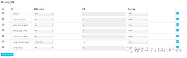 由于参与Cuboid生成的维度都会作为Rowkey,因此我们需要把这些列添加为Rowkey当中。在这个案例中,总共需要添加7个Rowkey。在每个Rowkey上,还需要为列值设置编码方法。在这个案例中,我们除了把LSTGFORMATNAME设置为fixedlength类型(长度为12)外,将其余的Rowkey都设置为dict编码。 Rowkey的顺序对于查询性能来说至关重要,如第六章所讲,一般把最经常出现在过滤条件中的列放置在Rowkey的前面,在这个案例中,我们首先把PARTDT放在Rowkey的第一位。接下来,按照层级把商品分类的字段跟随其后。最终,Rowkey的设置如下图所示: