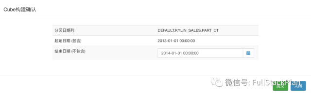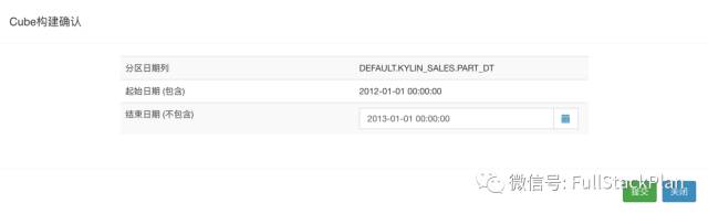 在创建数据模型的时候我们提到,我们希望采用增量构建方式对Cube进行构建,并选择了PART_DT字段作为分区时间列。在创建Cube时,我们需要指定Cube构建的起始时间,在这个例子中,根据样例数据中的时间条件,我们选择2012-01-01 00:00:00作为分区起始时间。