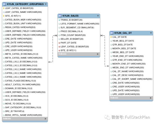 Kylin仅支持星型数据模型,这里用到的样例数据集就是一个规范的星型模型结构,它总共包含了3个数据表: