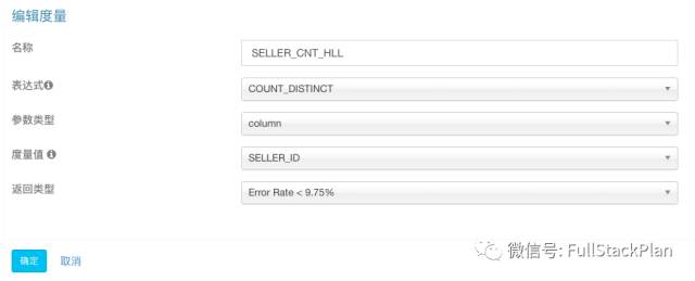 其次,我们还需要通过COUNT(DISTINCT SELLERID)考量卖家个数。根据前面章节的介绍,Kylin默认使用HyperLogLog算法进行COUNTDISTINCT的计算,该算法是个近似算法,在创建度量时需要选择一个近似度,本案例对精确性要求不高,为了提升查询性能,我们选择精度较低的“Error Rate < 9.75%”。同样的,我们再创建一个COUNT(DISTINCT LSTGFORMATNAME)的度量考量不同条件下的交易类型。