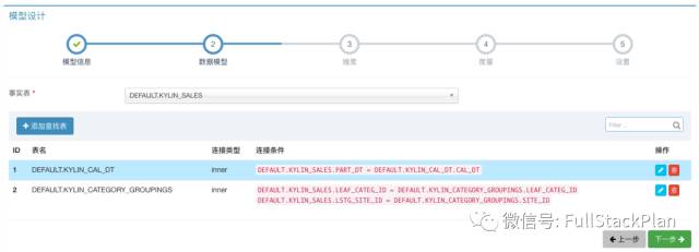 第二步,为模型选择事实表(Fact Table)和查找表(Lookup Table)。根据星型模型结构,选择KYLINSALES为事实表,然后添加KYLINCALDT和KYLINCATEGORY_GROUPINGS作为查找表,并设置好连接条件: