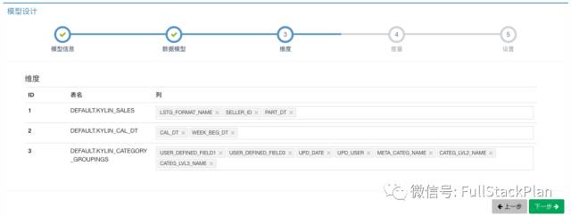 第三步,从上一步添加的事实表和查找表中选择需要作为维度的字段。一般的,时间经常用来作为过滤条件,所以我们首先添加时间字段。此外,我们再添加商品分类、卖家ID等字段为维度,具体情况如下图所示:
