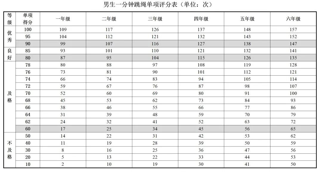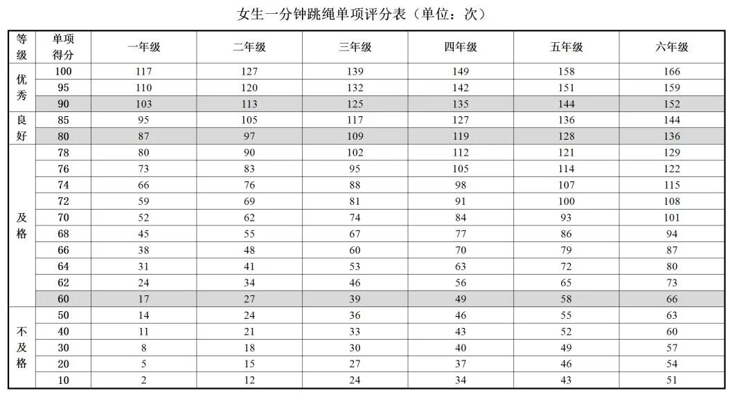 标准规定:一年级的男生每分钟至少要跳109个,女生至少要跳117个,才能到满分。