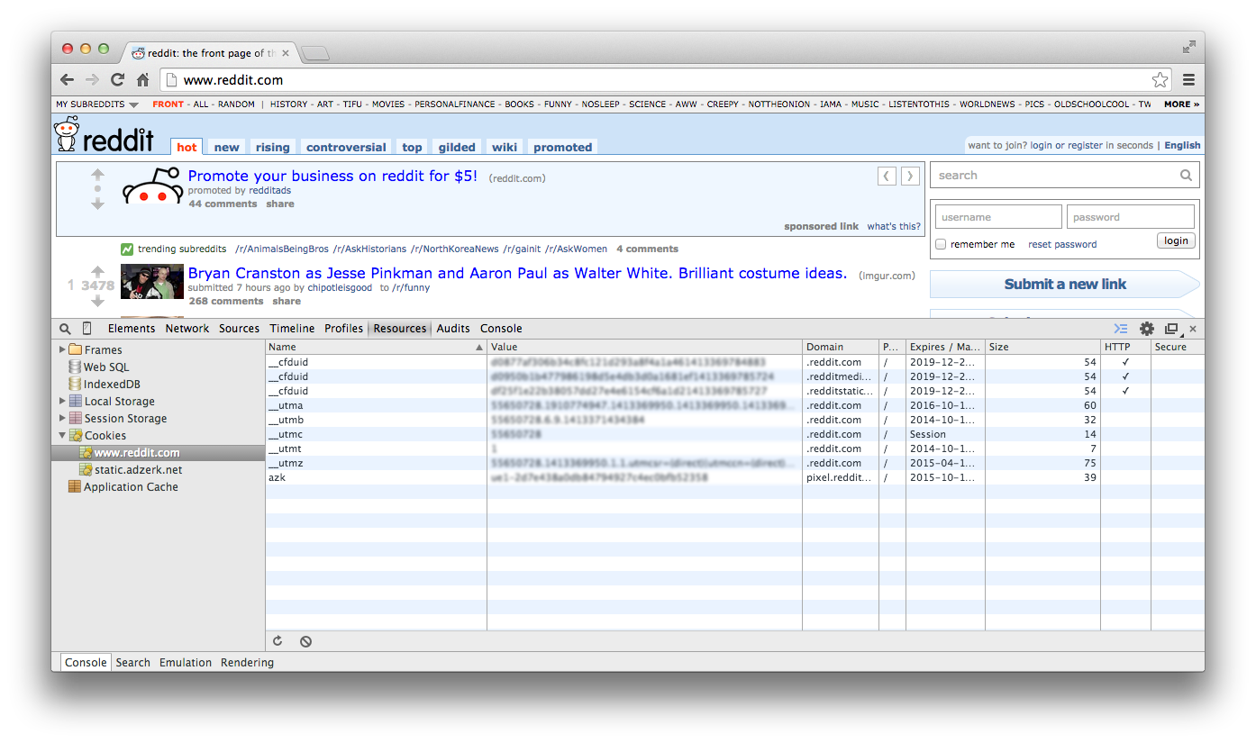 http://www.reddit.com - 把 cookies 那部分展开, 然后点击