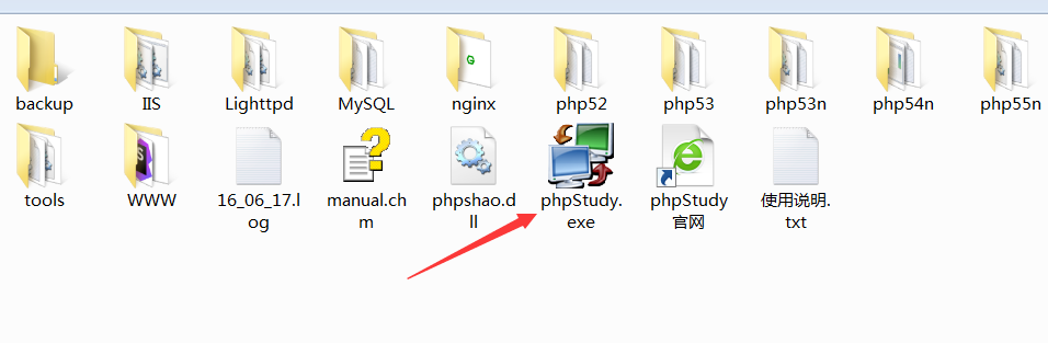 解压完成之后,打开目录,找到phpStudy打开,如下: