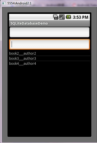 package com.android.tutor;import android.app.Activity;import android.content.Context;import android.database.Cursor;import android.os.Bundle;import android.view.Menu;import android.view.MenuItem;import android.view.View;import android.view.ViewGroup;import android.widget.AdapterView;import android.widget.BaseAdapter;import android.widget.EditText;import android.widget.ListView;import android.widget.TextView;import android.widget.Toast;public class SQLiteDatabaseDemo extends Activity implements AdapterView.OnItemClickListener { private BooksDB mBooksDB; private Cursor mCursor; private EditText BookName; private EditText BookAuthor; private ListView BooksList; private int BOOK_ID = 0; protected final static int MENU_ADD = Menu.FIRST; protected final static int MENU_DELETE = Menu.FIRST + 1; protected final static int MENU_UPDATE = Menu.FIRST + 2; public void onCreate(Bundle savedInstanceState) { super.onCreate(savedInstanceState); setContentView(R.layout.main); setUpViews(); } public void setUpViews(){ mBooksDB = new BooksDB(this); mCursor = mBooksDB.select(); BookName = (EditText)findViewById(R.id.bookname); BookAuthor = (EditText)findViewById(R.id.author); BooksList = (ListView)findViewById(R.id.bookslist); BooksList.setAdapter(new BooksListAdapter(this, mCursor)); BooksList.setOnItemClickListener(this); } @Override public boolean onCreateOptionsMenu(Menu menu) { super.onCreateOptionsMenu(menu); menu.add(Menu.NONE, MENU_ADD, 0, "ADD"); menu.add(Menu.NONE, MENU_DELETE, 0, "DELETE"); menu.add(Menu.NONE, MENU_DELETE, 0, "UPDATE"); return true; } public boolean onOptionsItemSelected(MenuItem item) { super.onOptionsItemSelected(item); switch (item.getItemId()) { case MENU_ADD: add(); break; case MENU_DELETE: delete(); break; case MENU_UPDATE: update(); break; } return true; } public void add(){ String bookname = BookName.getText().toString(); String author = BookAuthor.getText().toString(); //书名和作者都不能为空,或者退出 if (bookname.equals("") || author.equals("")){ return; } mBooksDB.insert(bookname, author); mCursor.requery(); BooksList.invalidateViews(); BookName.setText(""); BookAuthor.setText(""); Toast.makeText(this, "Add Successed!", Toast.LENGTH_SHORT).show(); } public void delete(){ if (BOOK_ID == 0) { return; } mBooksDB.delete(BOOK_ID); mCursor.requery(); BooksList.invalidateViews(); BookName.setText(""); BookAuthor.setText(""); Toast.makeText(this, "Delete Successed!", Toast.LENGTH_SHORT).show(); } public void update(){ String bookname = BookName.getText().toString(); String author = BookAuthor.getText().toString(); //书名和作者都不能为空,或者退出 if (bookname.equals("") || author.equals("")){ return; } mBooksDB.update(BOOK_ID, bookname, author); mCursor.requery(); BooksList.invalidateViews(); BookName.setText(""); BookAuthor.setText(""); Toast.makeText(this, "Update Successed!", Toast.LENGTH_SHORT).show(); } @Override public void onItemClick(AdapterView<?> parent, View view, int position, long id) { mCursor.moveToPosition(position); BOOK_ID = mCursor.getInt(0); BookName.setText(mCursor.getString(1)); BookAuthor.setText(mCursor.getString(2)); } public class BooksListAdapter extends BaseAdapter{ private Context mContext; private Cursor mCursor; public BooksListAdapter(Context context,Cursor cursor) { mContext = context; mCursor = cursor; } @Override public int getCount() { return mCursor.getCount(); } @Override public Object getItem(int position) { return null; } @Override public long getItemId(int position) { return 0; } @Override public View getView(int position, View convertView, ViewGroup parent) { TextView mTextView = new TextView(mContext); mCursor.moveToPosition(position); mTextView.setText(mCursor.getString(1) + "___" + mCursor.getString(2)); return mTextView; } }}
