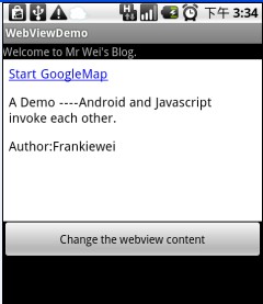 <html> <mce:script language="javascript"><!-- function fillContent(){ document.getElementById("content").innerHTML = "This Content is showed by Android invoke Javascript function."; } // --></mce:script> <body> <p><a onClick="window.demo.startMap()" href="">Start GoogleMap</a></p> <p id="content"></p> <p>A Demo ----Android and Javascript invoke each other.</p> <p>Author:Frankiewei</p> </body></html>