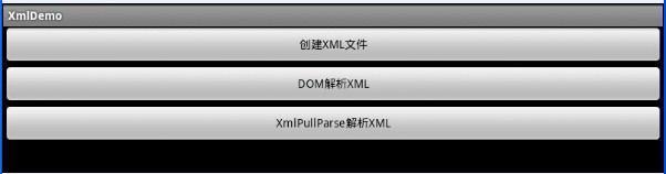 <?xml version="1.0" encoding="utf-8"?><LinearLayout xmlns:android="http://schemas.android.com/apk/res/android" android:orientation="vertical" android:layout_width="fill_parent" android:layout_height="fill_parent" > <Button android:id="@+id/btn1" android:layout_width="fill_parent" android:layout_height="wrap_content" android:text="创建XML文件" /> <Button android:id="@+id/btn2" android:layout_width="fill_parent" android:layout_height="wrap_content" android:text="DOM解析XML" /> <Button android:id="@+id/btn3" android:layout_width="fill_parent" android:layout_height="wrap_content" android:text="XmlPullParse解析XML" /> <TextView android:id="@+id/result" android:layout_width="fill_parent" android:layout_height="wrap_content" /></LinearLayout>