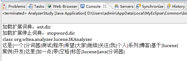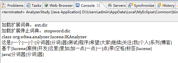 注:上述程序对analyzer进行了9次赋值,自己可以通过一一注解的形式查看每一种分词技术的分词效果。