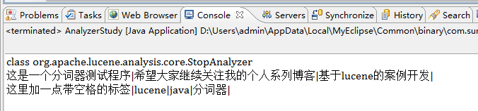 StopAnalyzer被忽略的词分词器,被忽略的词就是在分词结果中,被丢弃的字符串,如标点、空格等。上述事例在StopAnalyzer分词技术下的运行结果如下图: