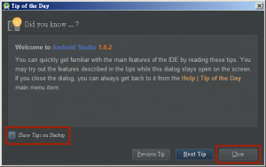 Android Studio启动新的应用程式视窗,第一次启动的时候会显示一个提示的视窗。取消“Show Tips on Startup”选项,下次就不会再出现。选择“Close”: