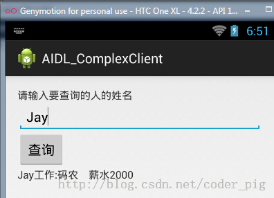 Step 2:编写简单的布局,再接着就是核心MainActvitiy的实现了 定义一个ServciceConnection对象,重写对应方法,和前面的普通数据的类似 再接着在bindService,然后再Button的点击事件中获取Salary对象并显示出来!