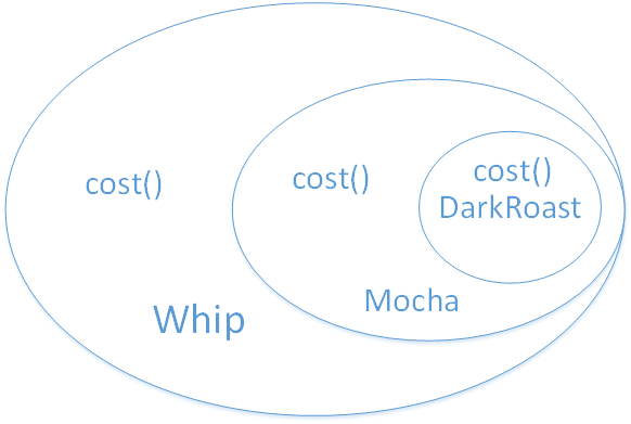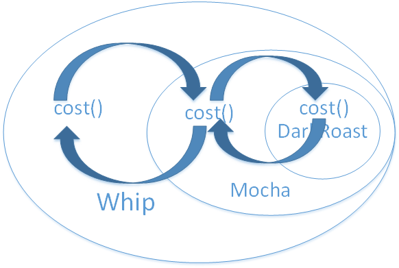 现在,当为顾客计算价格的时候,通过最外圈装饰者(Whip)的cost就可以办到。Whip的cost()会委托它所装饰的对象计算出价钱,然后加上奶泡的价钱。