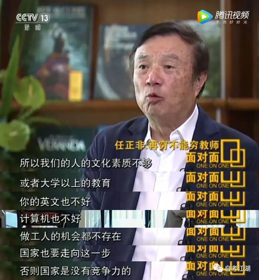 华为创始人任正非在采访时曾重点谈了中国的教育问题:“你没受过大专或以上的学历教育,你英文也不好,计算机也不好,那么你连做工人的机会都不存在。”